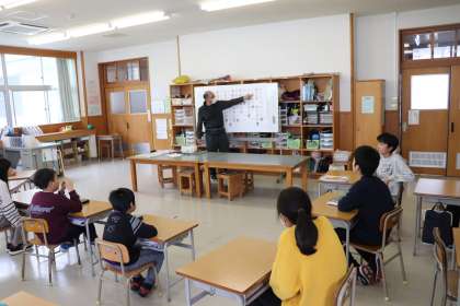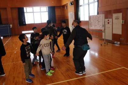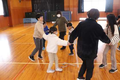 「あんたがたどこさ」では、輪になって歌いながら「さ」で方向を変えることに挑戦していました。