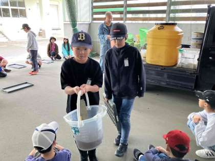 3,4限、5年生は総合で「稲の種まき」を行いました。