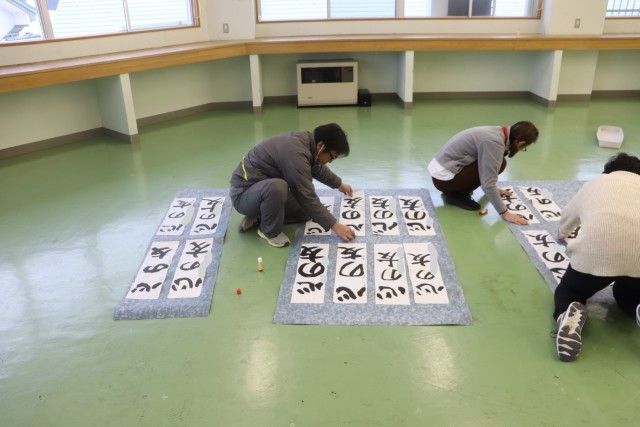 教職員による書き初め展示作業