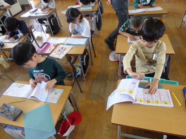 2年生の2時間目は国語の授業でした。漢字の学習です。新しい漢字を練習するだけでなく、「おとなになる」「どくしょをする」「まとにあたる」など熟語の問題や送り仮名を含めて書く問題などの「力だめし」のページにも取り組みました。