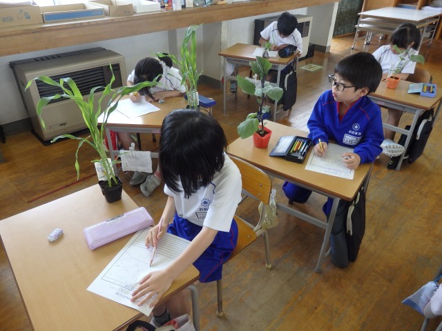 2年生の3時間目は生活の授業でした。野菜の観察日記を書きました。パプリカやとうもろこし、トマトなど、自分が育てたい野菜を受け取ると、さっそくじっくりと観察を始める子どもたちでした。大きさや色、形など隅々まで細かいところもよく観察し、触った感触も確かめて絵に描いたり、文章で書いたりしました。目をこらして見入る目がいいですね。