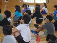 3,4年生の国際交流会。最後にみんなで記念写真です。撮影後には3人のもとへ駆け寄り、「サンキュー!」と言いながらハイタッチをする子どもたちでした。