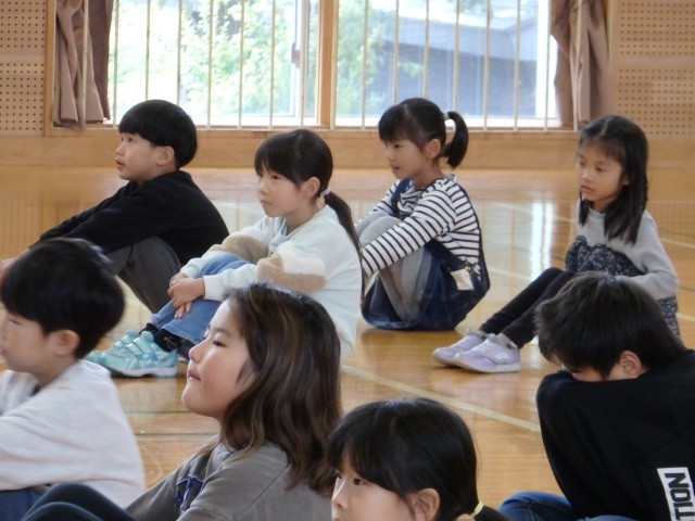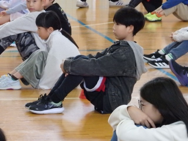 生活朝会で代表の子の発表や先生の話を聞くときの姿勢がいい子がたくさんいます。顔をしっかり上げて、話す人に目を向けて聞いていました。