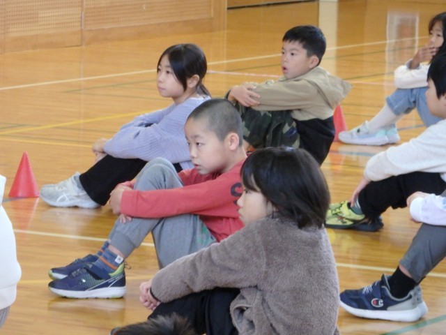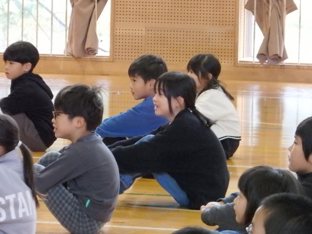 その後、11月の生活目標「相手の気持ちを考えて 友だちいっぱい、笑顔いっぱい」について生活指導担当の先生が話しました。また、縄跳びを練習している場面で、目標100回が達成できたのに、知らんぷりしている場面と一緒に喜んでくれる場面を先生たちが劇をして、「共感」ということばについて考えました。+7