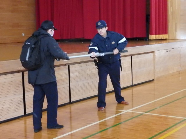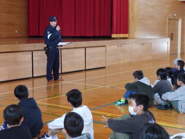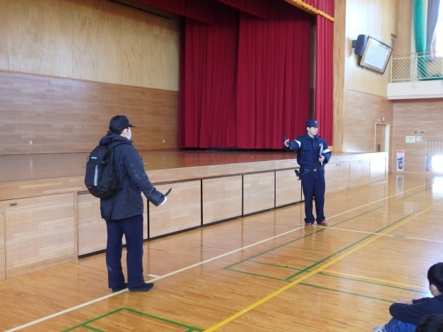 今日の2時間目は不審者対応の避難訓練を行いました。子どもたちには、今日実施ということしか知らせておりませんでしたので、朝からドキドキで、1時間目に各教室を回っているときも窓から見えた私を見つけて一瞬焦る子どもたちでした。南魚沼警察署の五日町駐在所と宮駐在所のお二人の巡査からご指導をいただきました。また、学校内への不審者侵入だけでなく、登下校時に不審者に遭遇した場合の対応についてもご指導いただきました。「20mを全力ダッシュ」「近所の人や地域の人の中にまぎれて見かけない人がいないか注意する」の2点が大切だとのことでした。そのことを受け、「登下校時など日頃から地域の人に会ったときにあいさつをして顔なじみになりましょう」と話しました。