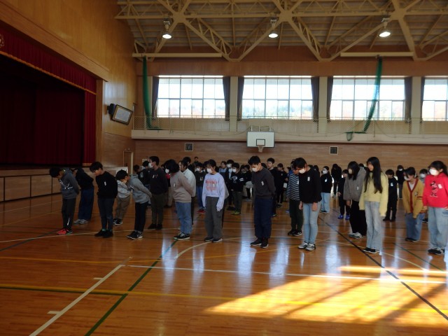 1,2,3年生の持久走大会の閉会式です。各学年男女別の1~3位が発表されました。そして、各学年の代表の子たちが振り返りを発表してくれました。めあてが達成できた子もできなかった子も最後まで一生懸命頑張ったと発表してくれました。最後に応援をしてくれた地域の方やお家の人に「応援ありがとうございました!」と感謝の気持ちを伝えて終了です。みんな、とっても頑張りました!