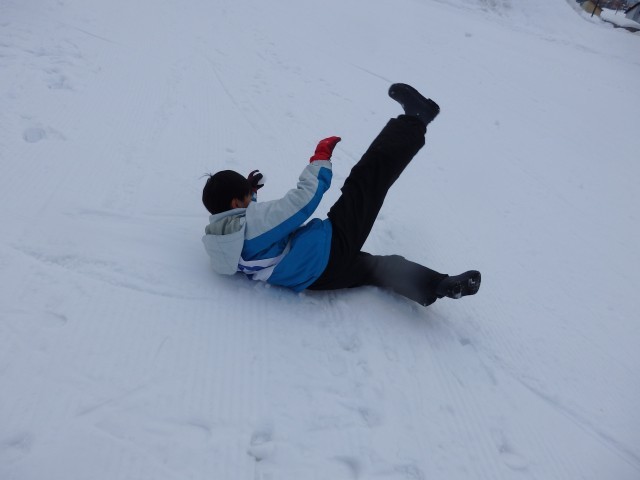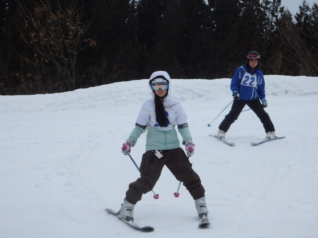 レッスンを受けている様子です。今日はポールの練習はせず、直滑降からボーゲンの形に足を開いたり閉じたりする練習をしたり、パラレルターンの練習をしたりしました。