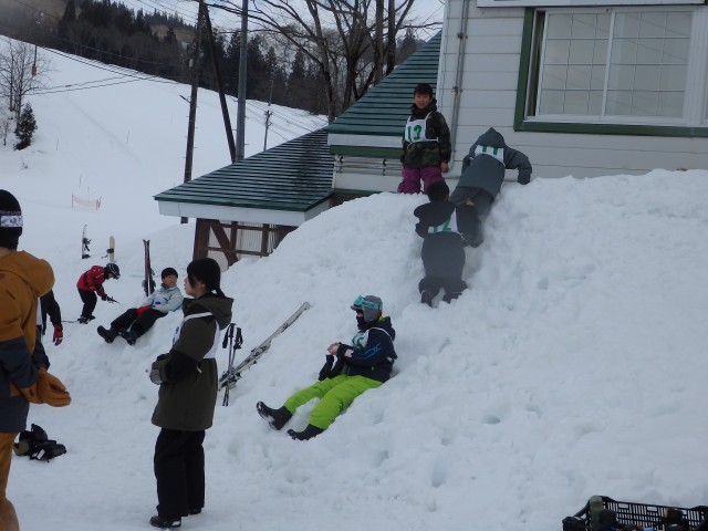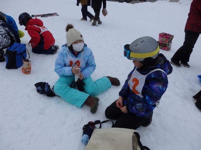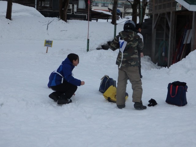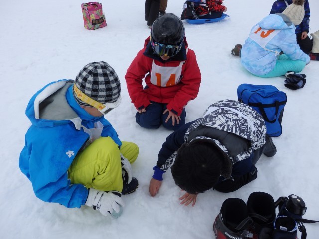 終了式で指導者の皆様とスキー場にあいさつをして、今日のスキー授業は終了です。バスを待つ間、しばし休息タイムです。ミニ雪だるまを作っていた子たちがいました。