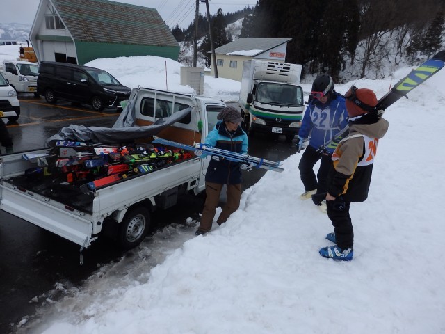 指導者の先生にあいさつをしたら終了式まではしばしの休憩時間。寝そべったり座ったりしてお話しする子どもたち。中にはおもむろに腕立て伏せを始める子がいました。軽トラックにスキーを積み込んで終了式です。