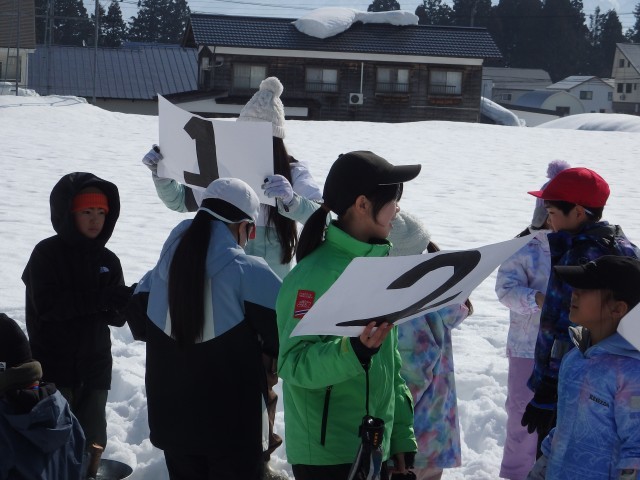 5,6年生のスキー授業。終了式で指導者の皆様とゲレンデに挨拶をして終了です。天気予報どおり雪も降らず最高でした。5,6年生は3回とも天気に恵まれました。