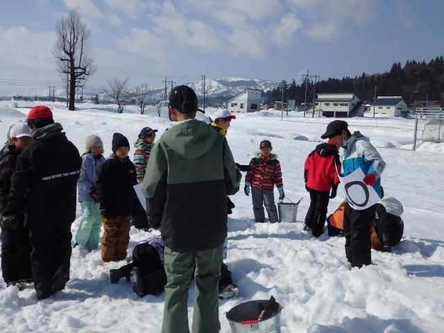 レッスン終了です。スキーを軽トラに積み、ブーツを履き替えたら集合です。すきま時間に雪で作った「おにぎり(具は愛情)」を担任の先生にプレゼントした子がいました。