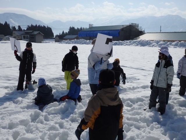 3,4時間目は児童会行事「スノーフェスティバル」を行いました。「ひまわり班」で協力して、グラウンドに雪像を作ります。朝は雨が少し降っていましたので心配しましたが、スノーフェスティバルが始まる頃にはご覧のように青空が広がる快晴でした。いち早くグラウンドに出てきた6年生が数字が書いてあるカードを掲げて、自分の班の1~5年生を集めて、整列させてくれました。運営委員会の子たちが司会の開会式をして、さっそく雪像作りのスタートです。