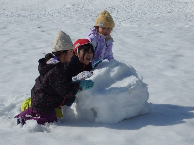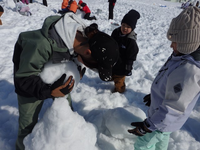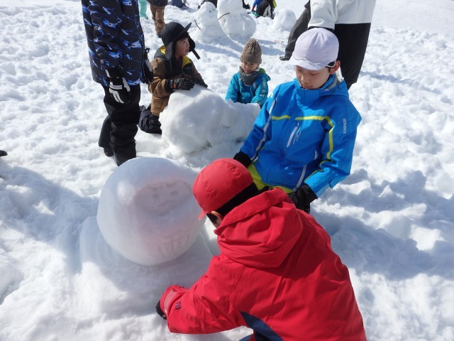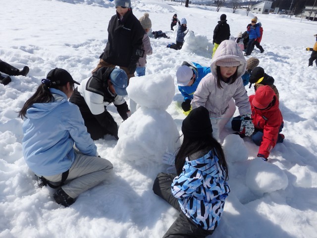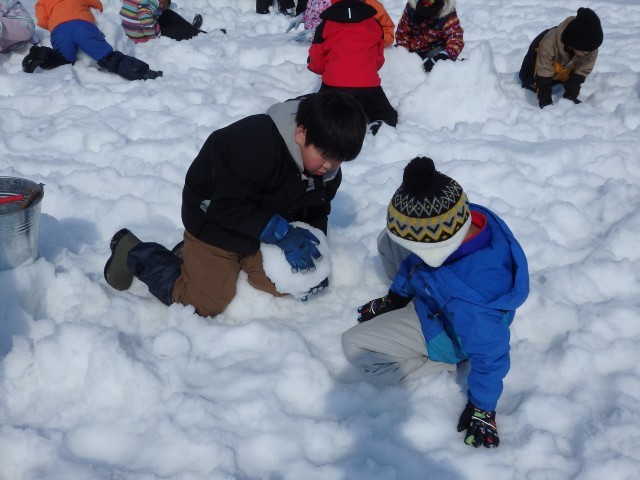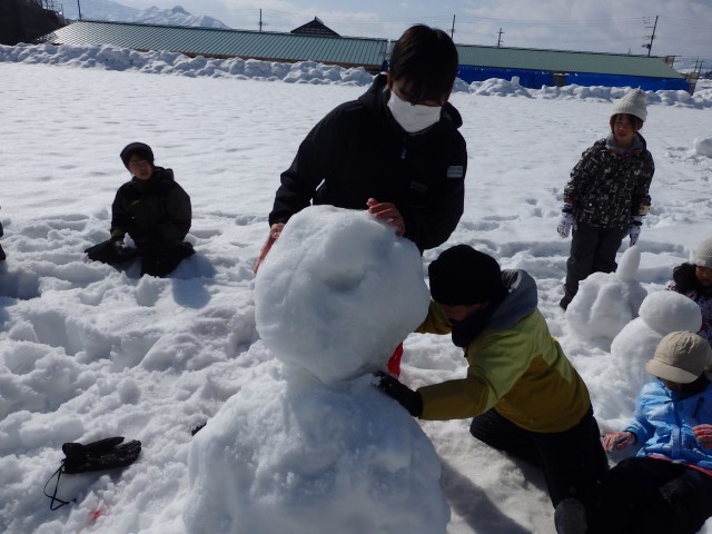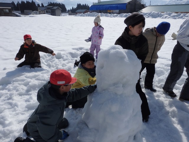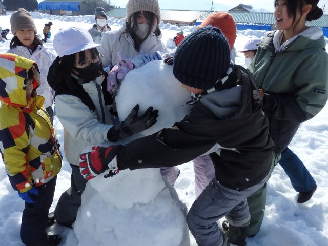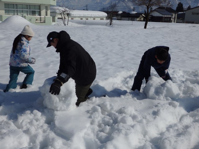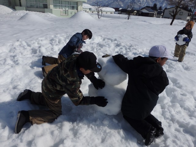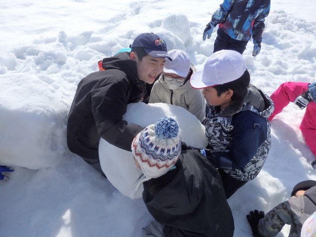 雪像作りもまずは大きな雪の玉を作ります。大きくなってくると重くなって低学年の子達では転がせません。上の学年のお兄さんお姉さんが助けてあげて一緒に転がします。