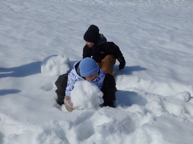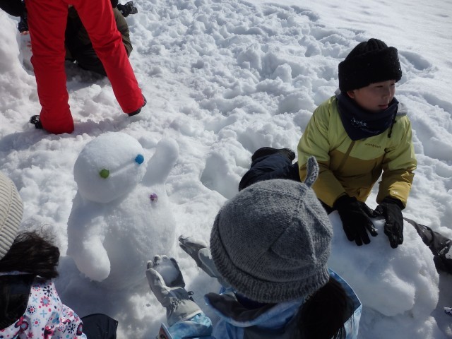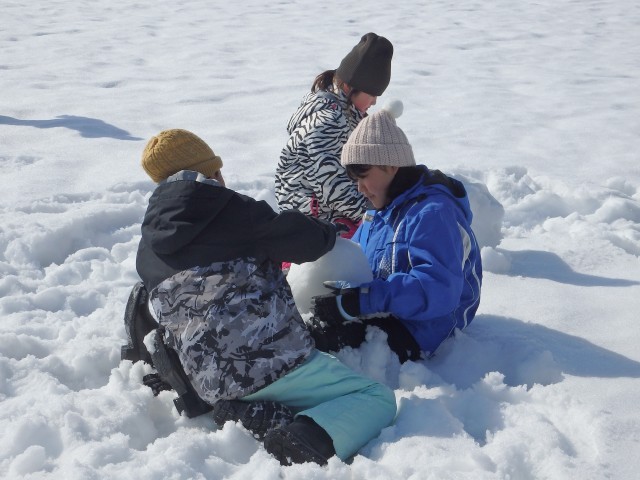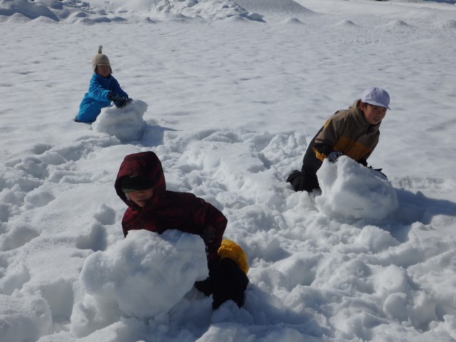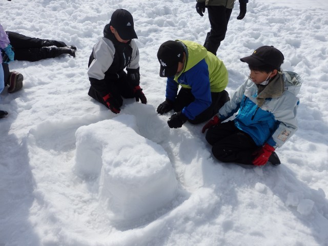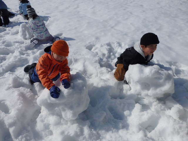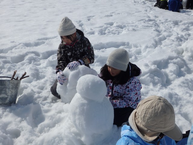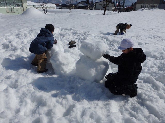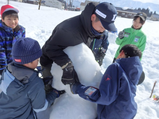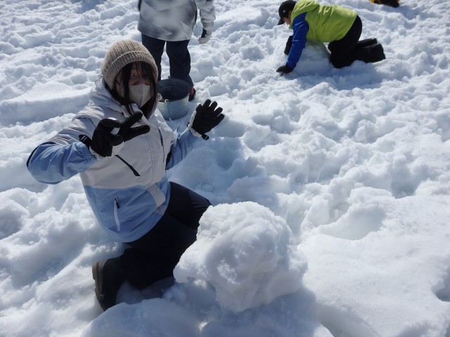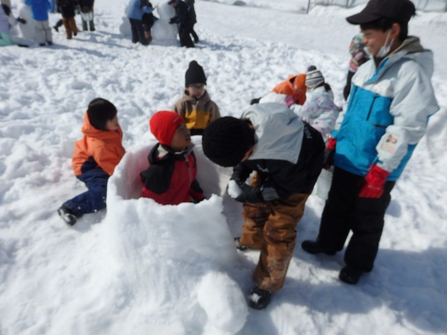 雪像作りもまずは大きな雪の玉を作ります。大きくなってくると重くなって低学年の子達では転がせません。上の学年のお兄さんお姉さんが助けてあげて一緒に転がします。