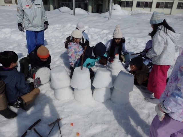 大きな雪玉ができたら上に積み重ねていきます。ここも上学年のお兄さんお姉さんの出番ですね。3つ、4つと積み重ねて高いタワーのようにしている班もありました。また、雪玉ではなくバケツに雪を詰めてプリンのような形を作って、何個も並べている班がありました。何ができるのかはお楽しみです。