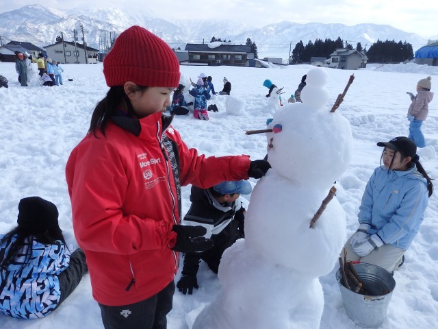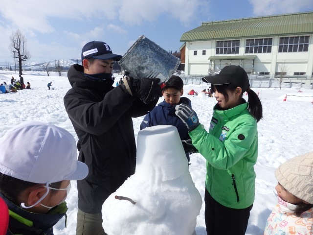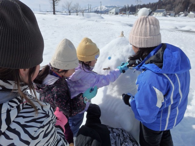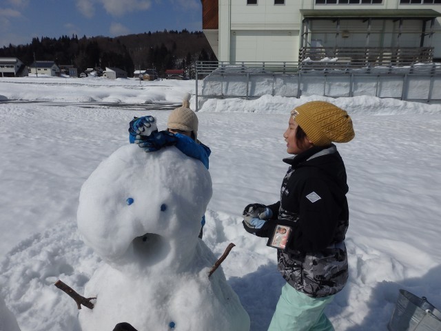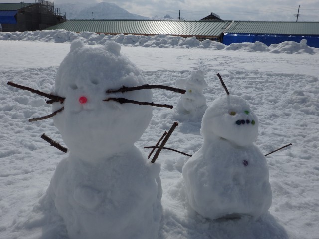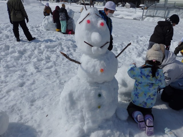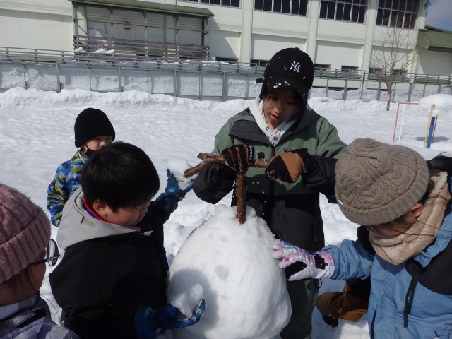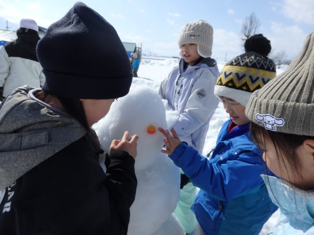 雪像作りも仕上げに入りました。スーパーボールや木の枝で手足や顔を作っていきます。木の枝をTの字に付けて「タケコプター」を作っている班がありました。また、木の枝の皮だけを使って眉毛を付けていた2人の1年生がいました。ナイスアイディア!