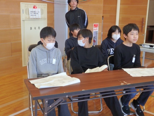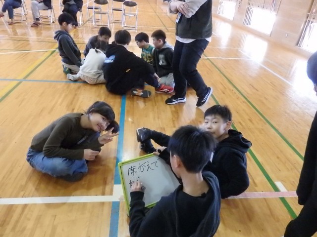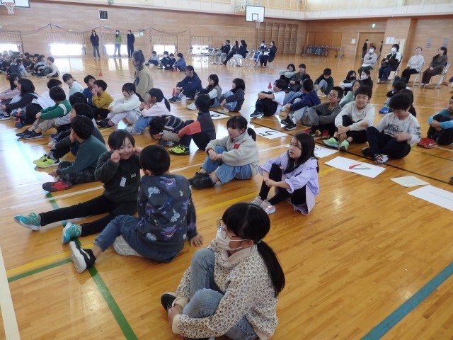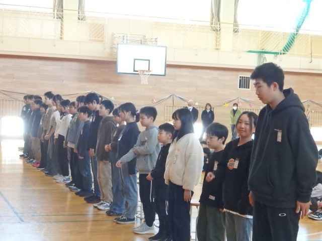 今朝は1~5年生が応援練習を行いました。4年生がリーダーとなって行う「親善スキー大会激励会」のための練習です。雪が降って気温がガクッと下がった体育館でしたが、大きな声でエールを練習しました。応援リーダーをする4年生2人の吐く息が白くなっています。1年生も頑張って声を出していました。終了後、4年生は水曜日の本番に向けて改善点を話し合っていました。