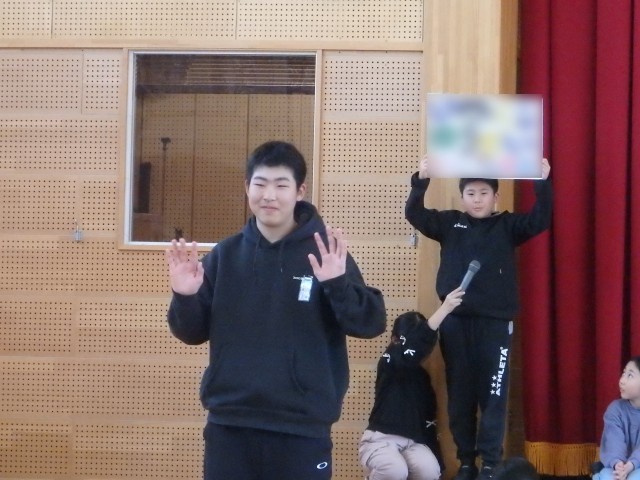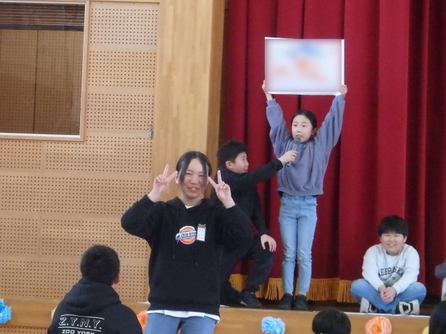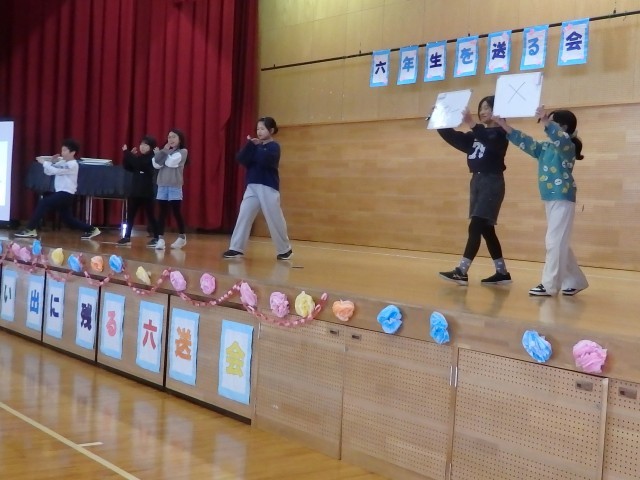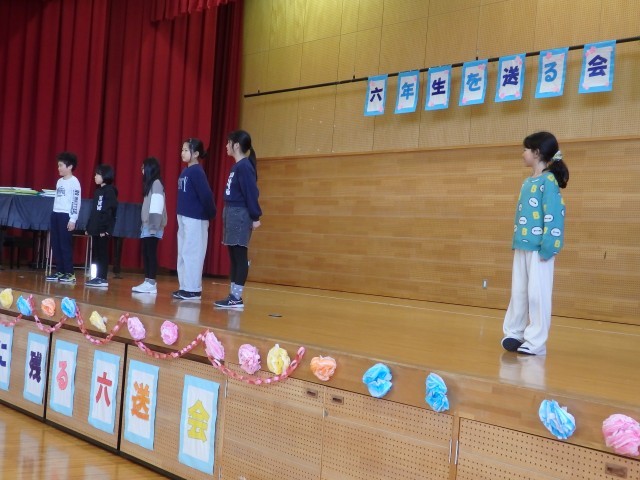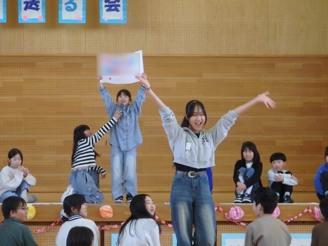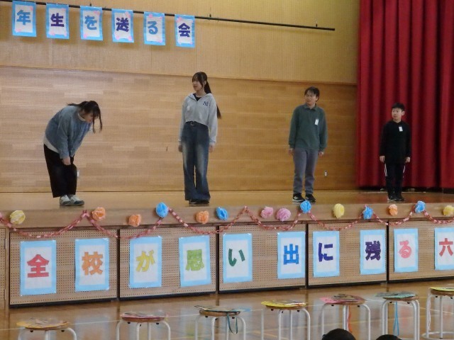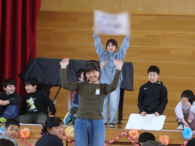 6年生を送る会。3年生による「6年生紹介」のラストです。担任の先生たちも紹介されました。最後は3年生から「今までありがとうございました。中学校でも頑張ってください」とメッセージが送られました。