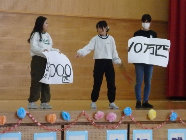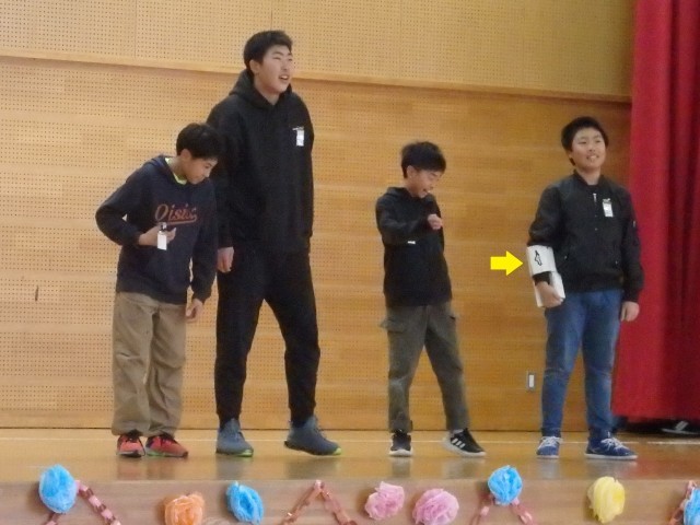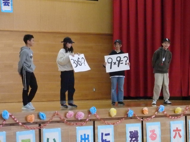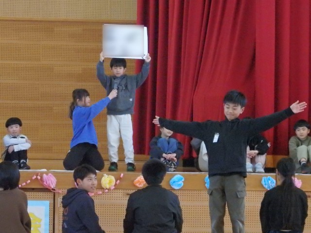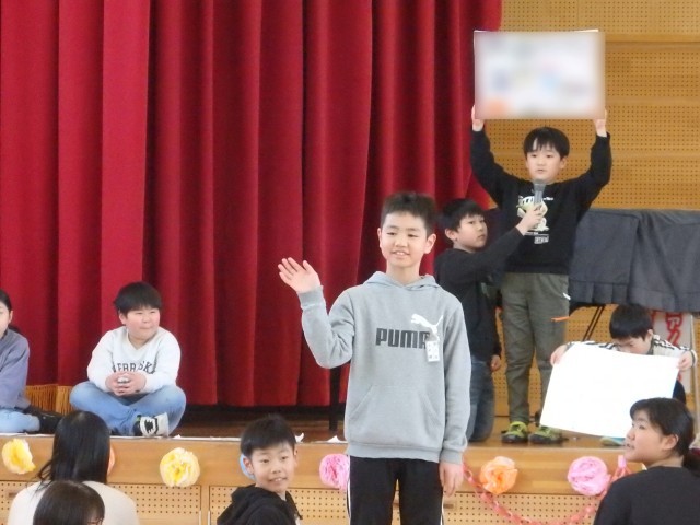6年生を送る会。続いてのプログラムは6年生による「6年間の思い出+誰でしょうクイズ」でした。6年生が小さいときの写真が映し出され、「○○さんはどれでしょう?」や「これは誰でしょう?」とクイズが出題されました。そして1年生から6年生までの各学年での思い出を劇にして発表されました。1年生では入学のときやアサガオを育てたこと、2年生では九九の学習やアルプの里へ行ったこと、3年生ではイオン見学、4年生では魚野川への稚魚放流、5年生では自演体験活動や米づくり、6年生では親善陸上大会のことが紹介されました。9枚目の写真の→で示しているのは何だと思いますか?