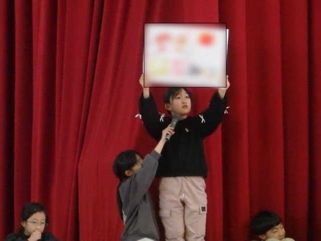 6年生を送る会。3年生による「6年生紹介」の続きです。1人1人のポーズにも個性が出ていますね。