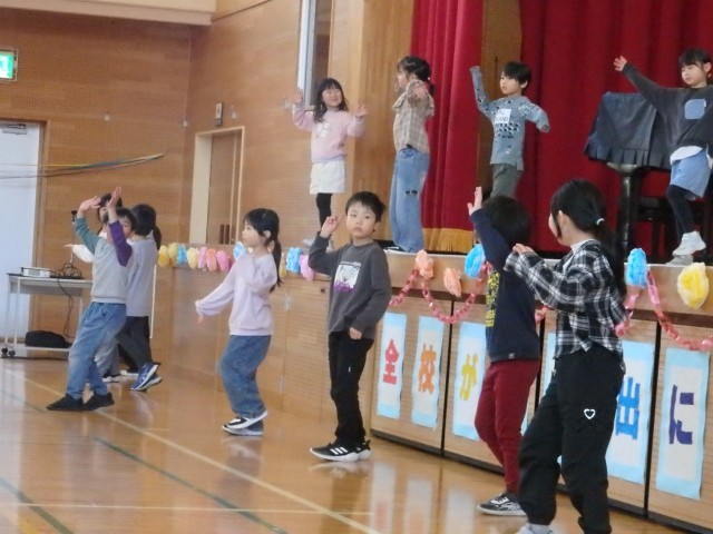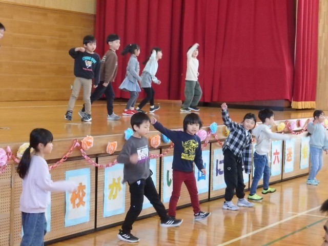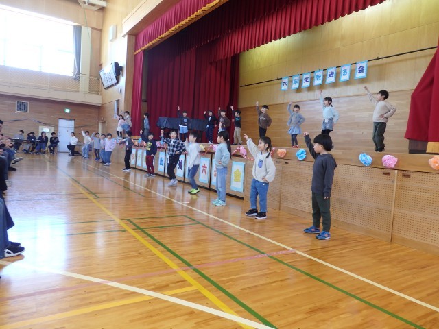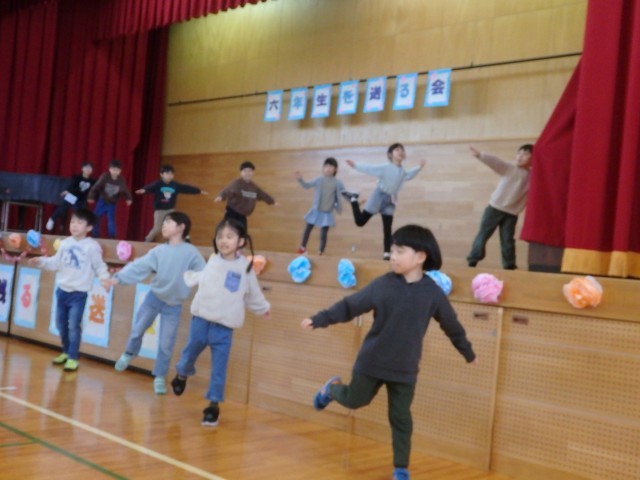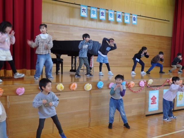 6年生を送る会。続いてのプログラムは1年生のダンスです。2曲もダンスを披露してくれました。1年生らしい元気でかわいらしいダンスに会場は拍手の渦で大盛り上がりでした。1年生は初めての「6送会」でしたが、練習がんばりましたね。