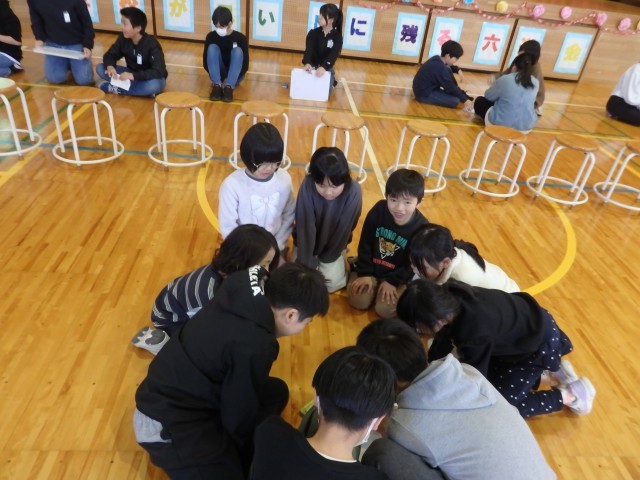 6年生を送る会。続いてのプログラムは4年生による全校ゲームです。ひまわり班に分かれて、6年生の心の中を読み取る「以心伝心ゲーム」を行いました。ルール説明をして、ひまわり班ごとに集まります。