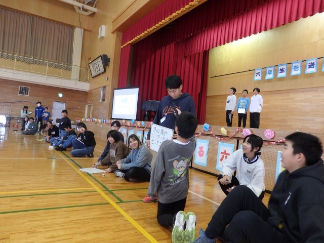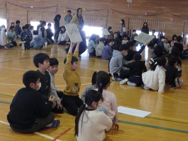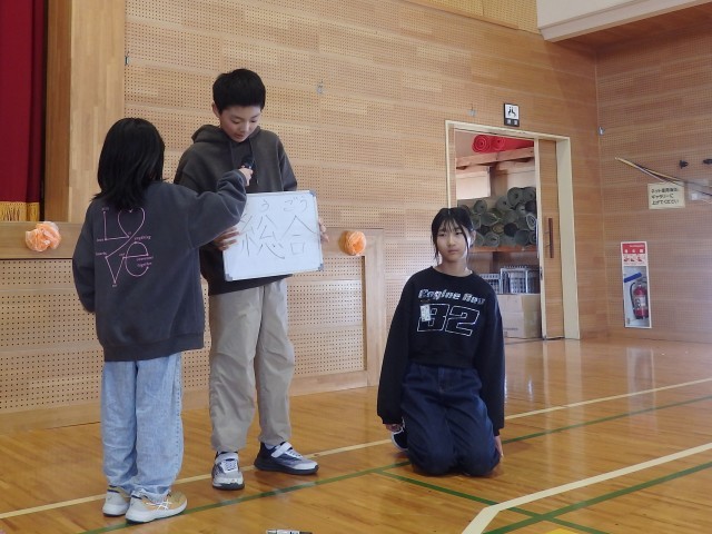 6年生を送る会。4年生による「6年生と以心伝心ゲーム」です。1問目は「小学校生活の中で一番うれしかったことは?」でした。1~5年生チームは「修学旅行」「運動会」と書くのに対して、6年生の回答は・・・「席替えで一番後ろになったこと」「冬の席がヒーターの前になったこと」「みんなでトランプ」などでした。全班、以心伝心ならす。2問目は「一番好きな教科は?」でした。さすがの6年生も答えをひねりようがないので正解した班がありました。