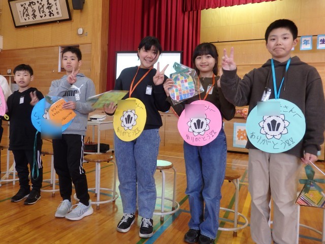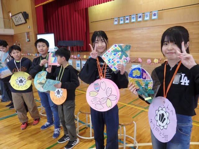 6年生を送る会。2年生からのプレゼントを手に笑顔満開の6年生です。
