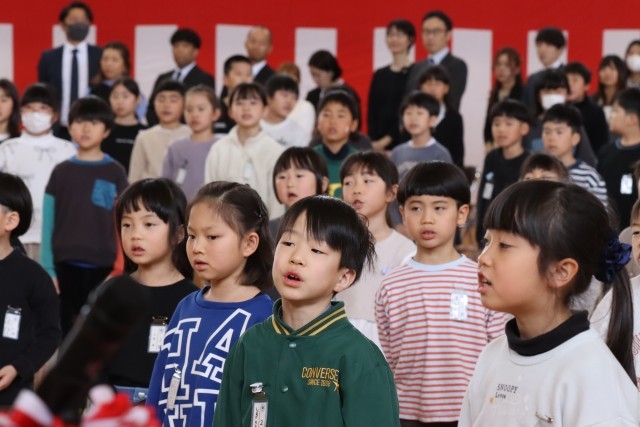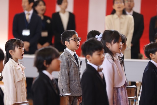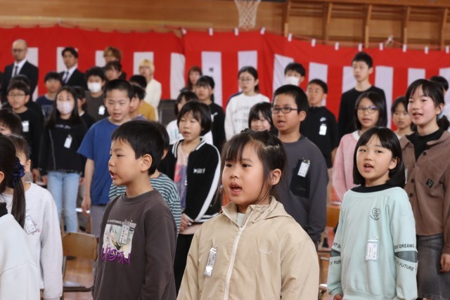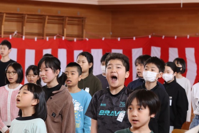 卒業生が「旅立ちの日に」を歌い終えると、最後の呼びかけです。5年生の「卒業生との名残は尽きませんが、どうかお元気で」の呼びかけの後、在校生から卒業生へ、卒業生から在校生へ、全校という3回の「さようなら!」が感動的でした。そして最後の校歌斉唱です。在校生の力の見せどころです。圧巻の歌声でした。