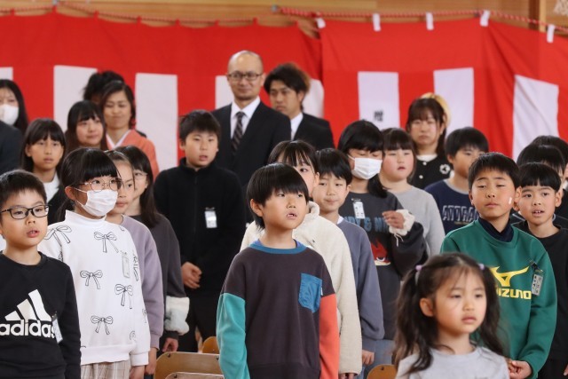 終業式での校歌を歌う姿です。1~4年生を中心に大きな声で歌声を盛り上げてくれています。明日の卒業式も楽しみです。式の最後に、4月から他市へ転校してしまう子が全校の前であいさつをし、みんなから「頑張って!」の気持ちを込めて拍手を送りました。また、地域の福祉施設の方から雑巾を寄贈していただきましたので全校に紹介をしました。ありがたく使わせていただきます。