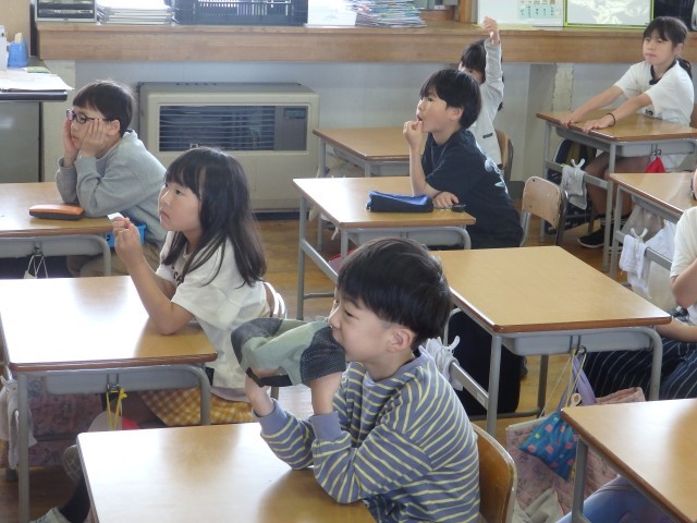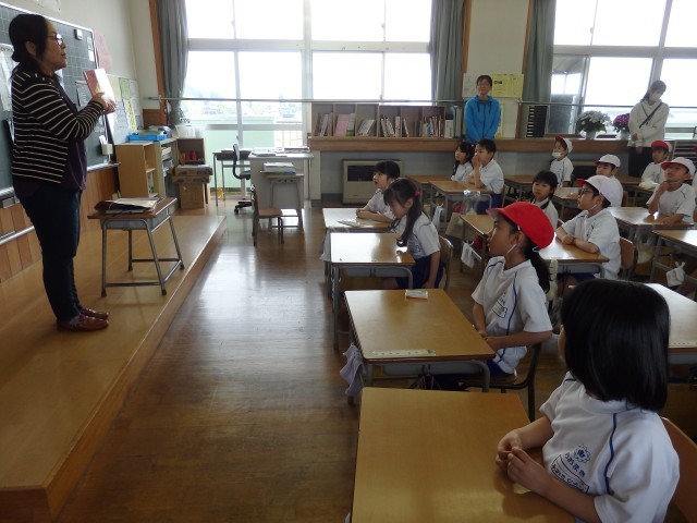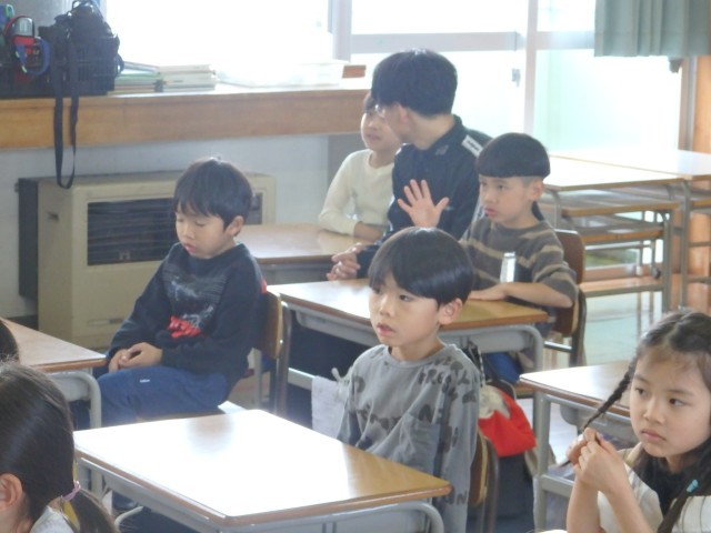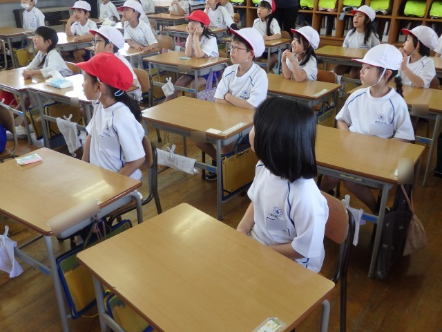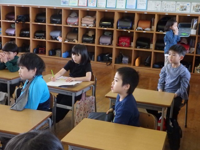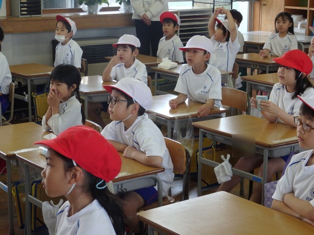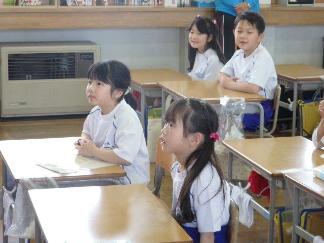 1,2年生の1,2時間目は生活の授業でした。2年生が『1年生に教えたい」という学習で、1年生に学校案内をしました。1時間目は音楽室、図書室、体育館を案内しました。音楽室ではイスの持ち方、図書室ではどこにどんな本があるのか、体育館ではボールの使い方などを教えてあげていました。1年生もお兄さんお姉さんの話を「目」でしっかり聞くことができました。