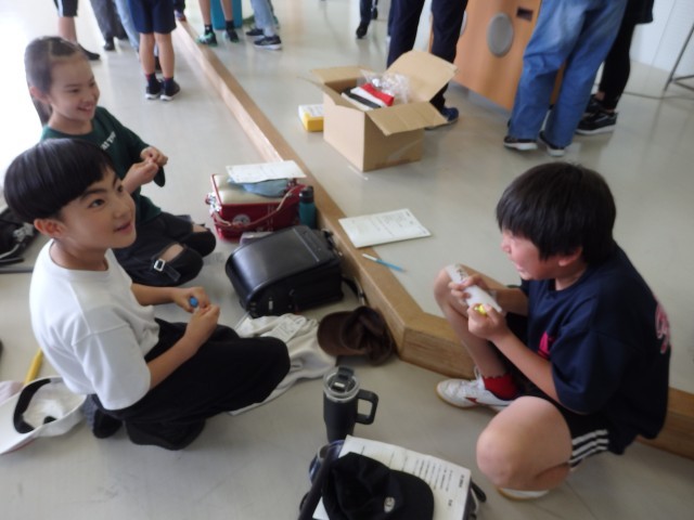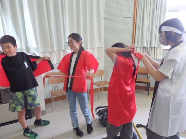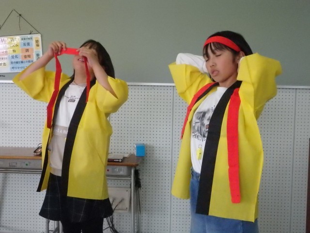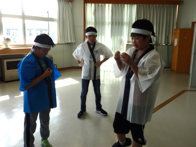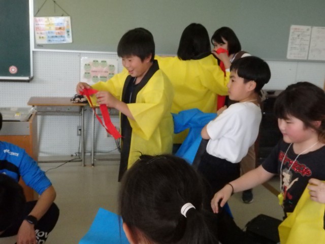 運動会プロジェクト。応援リーダーたちの様子です。1人1人に笛、はちまき、はっぴが配られました。まるで卒業式の証書授与のように恭しく両手ではっぴを受け取る応援団長でした。4年生のある子は笛を受け取って「これが欲しかったんだぁ~!」とテンションマックス。さっそくはっぴを着て、はちまきを締め、首から笛を提げて、本番と同じ姿になる子どもたちでした。