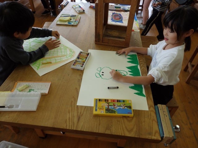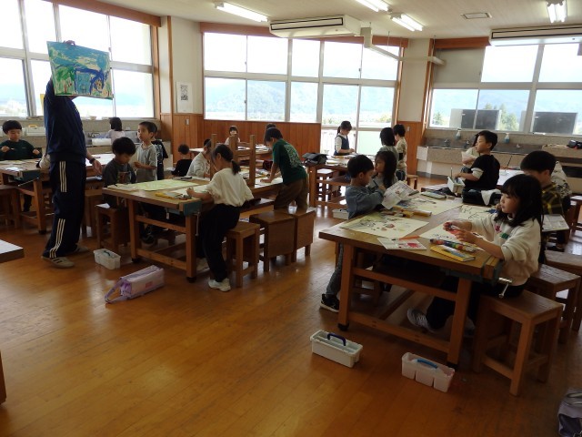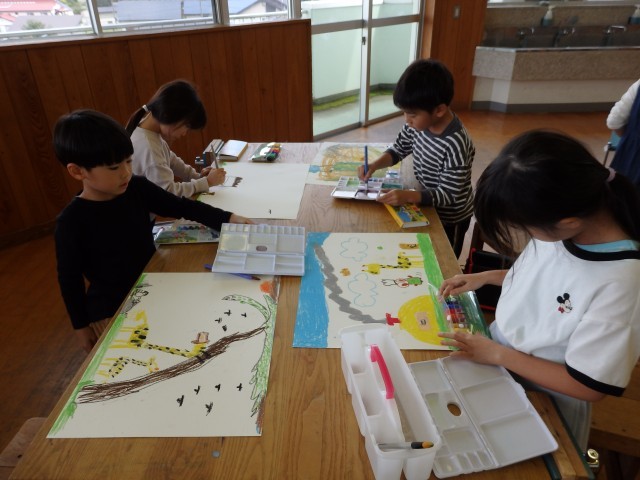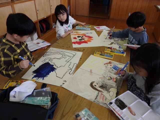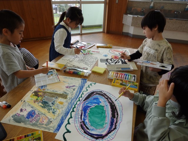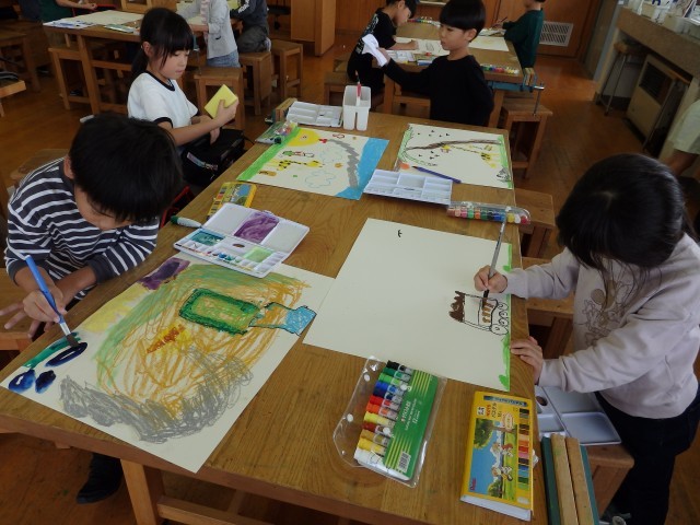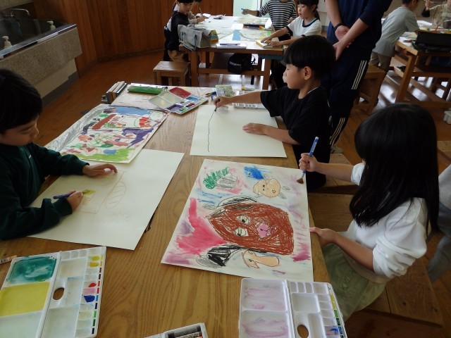 1年生の4時間目は図工の授業でした。「おはなしだいすき」というテーマで絵を描きます。自分の好きな絵本を読んで、心に残った場面を描きます。「パンどろぼう」や「すしん」などの物語をもとにクレヨンや絵の具で一生懸命描いていました。いろいろな絵の具を混ぜては「こんな色ができたよ!」と見せてくれました。