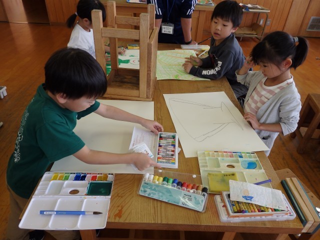 1年生の2時間続きの図工の授業、3時間目の様子です。初めて絵の具を使って色を塗ります。最初にバケツやパレットの使い方を教わり、好きな色を出して塗っていきました。どの色とどの色を混ぜるとどんな色ができあがるのかいろいろ試しながら塗っていきました。いきなり濃い色を塗らずに、薄い色から塗っていくことができました。