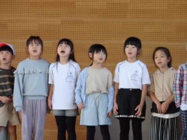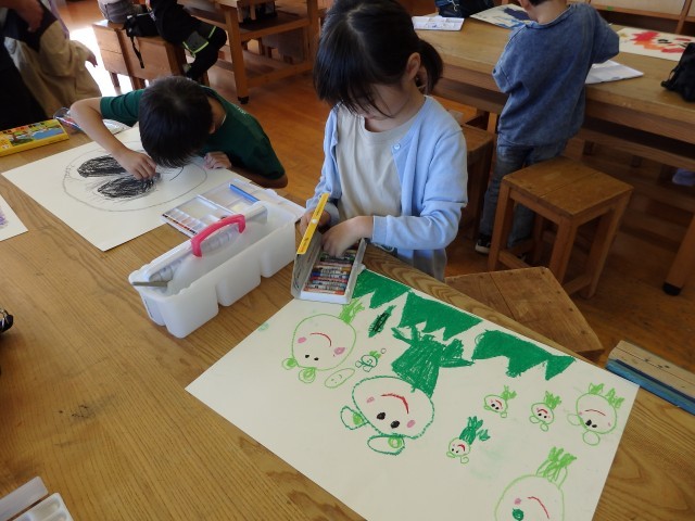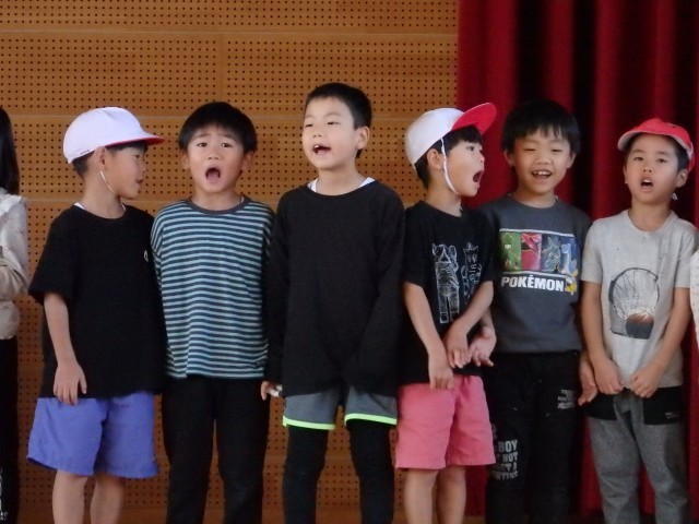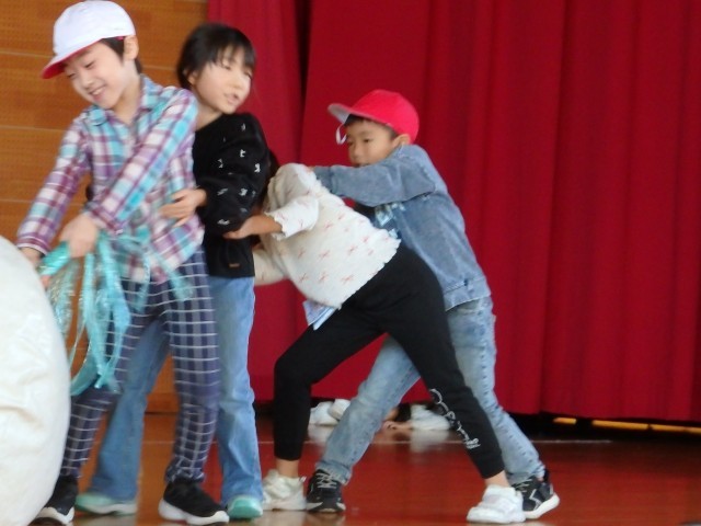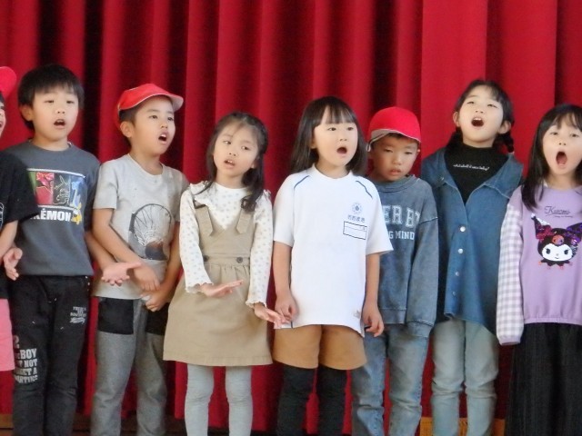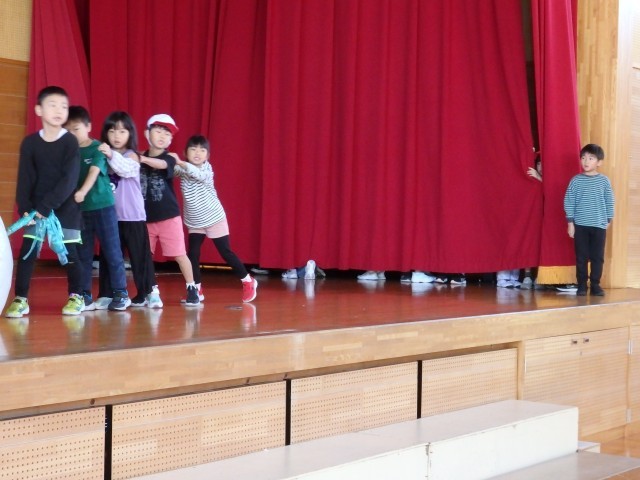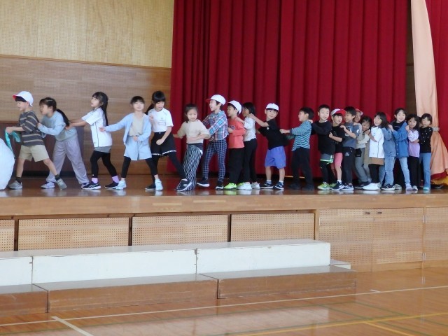 1年生の3時間目は生活の授業でした。学習発表会の練習をしていました。「おおきなかぶ」の劇をします。場面ごとのグループになってセリフと動きの連取をしていました。「うんとこしょ どっこいしょ」とかぶを引く場面では、みんなでつながって楽しそうに練習していました。もう自分のセリフを覚えて、見ないで言える子がたくさんいました。