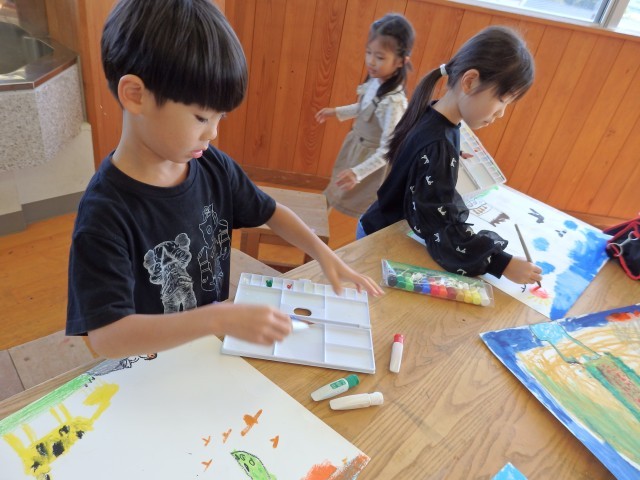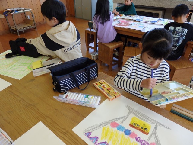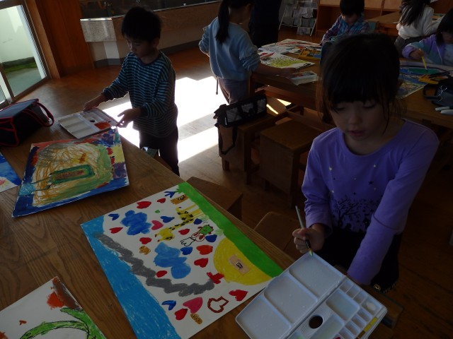 1年生の1時間目は図工の授業でした。絵本のお話をもとにして絵を描いていました。みんな着々と完成に近づいています。絵の具も上手に使えるようになってきました。