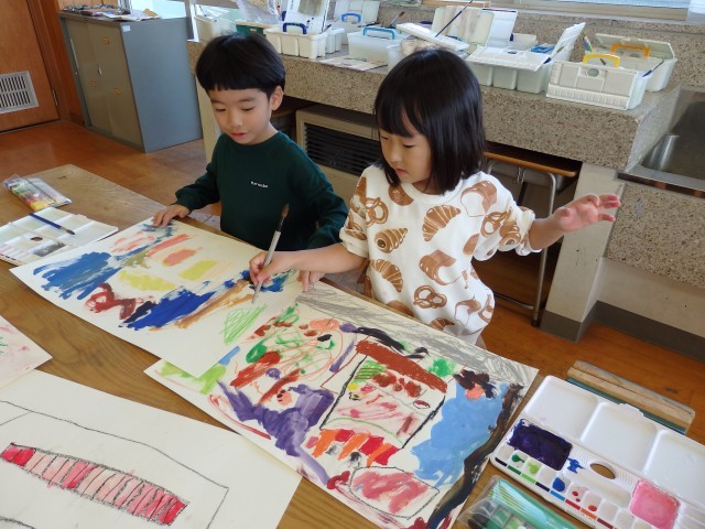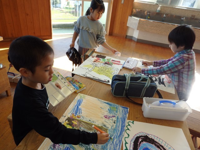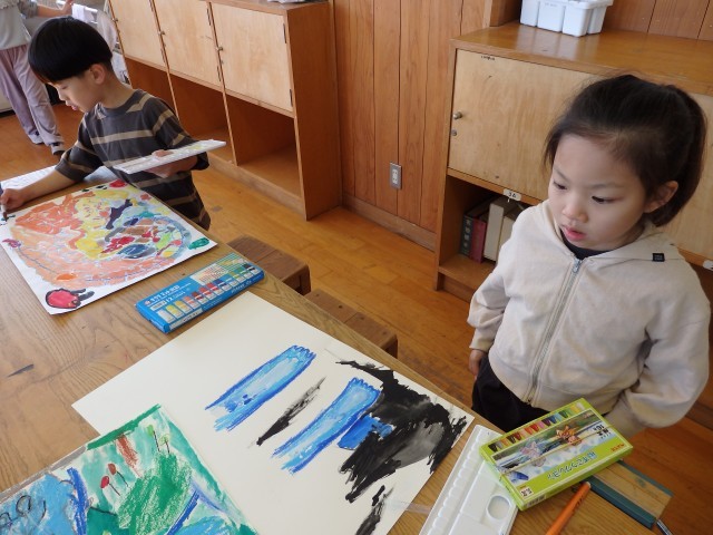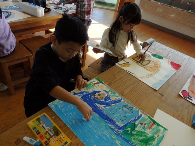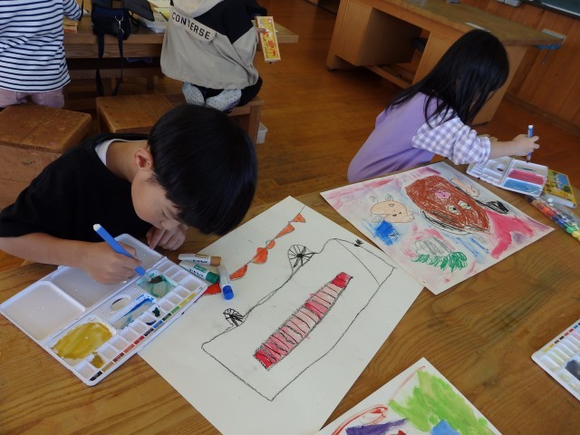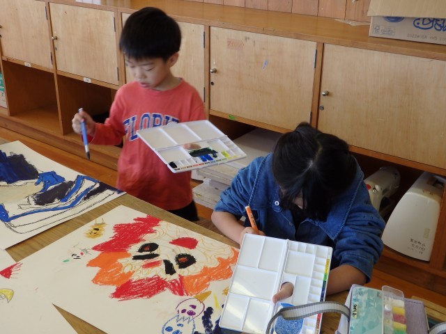 1年生の4時間目は図工の授業でした。「おはなしだいすき」というテーマで絵を描きます。自分の好きな絵本を読んで、心に残った場面を描きます。「パンどろぼう」や「すしん」などの物語をもとにクレヨンや絵の具で一生懸命描いていました。いろいろな絵の具を混ぜては「こんな色ができたよ!」と見せてくれました。