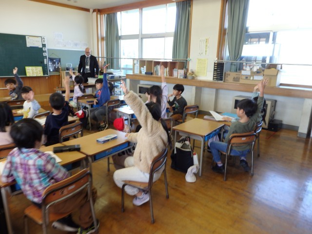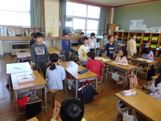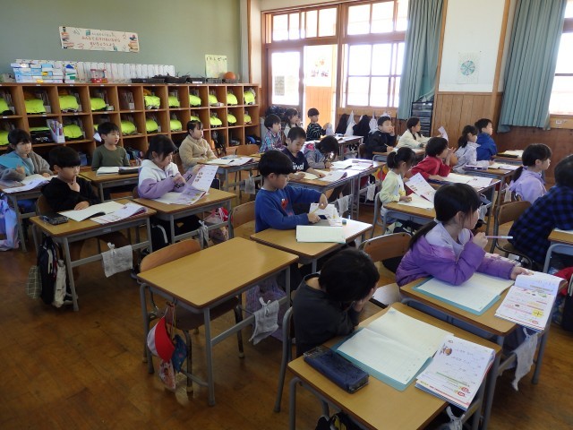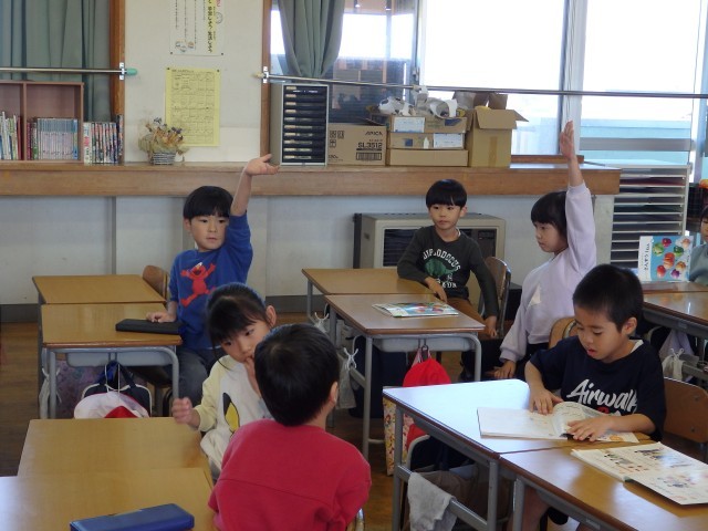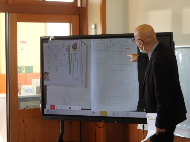 1年生の2時間目は国語の授業でした。市教委にある学習指導センターの指導主事から授業を見ていただく職員研修としての授業でした。「かいがら」の学習です。まずはみんなで音読をしたり、隣の人とペアで丸読みをしました。その後、どんなお話だと思うか発表していきました。「~と書いてあるから、○○なお話だと思う」と書かれていることを基にして考えを発表しました。また、「一番大切な物をあげたから、優しいお話だと思う」という意見に対して「どこに『一番大切な物をあげた』ことが書かれているのか」をみんなで確かめました。