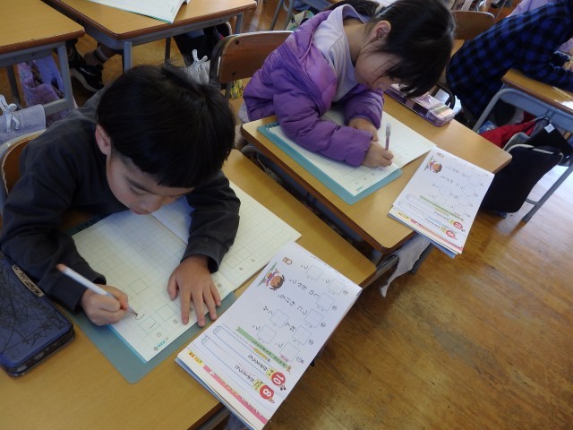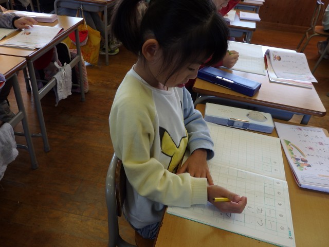 1年生の5時間目は国語の授業でした。カタカナのラ行の練習をしていました。書き方の練習ノートの字を指でなぞってから1つずつていねいに書いていました。