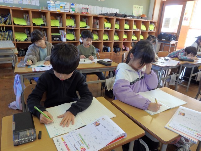 1年生の5時間目は算数の授業でした。計算ドリルで引き算の問題に取り組んでいました。たくさんの問題を解いて計算の力を高める時間です。友だちと教え合いながら一生懸命に取り組んでいました。