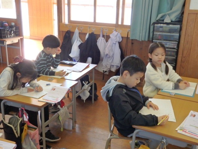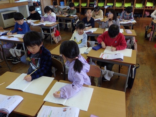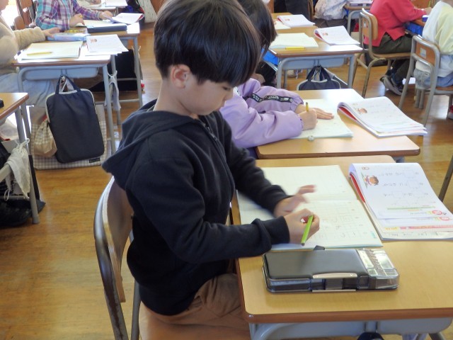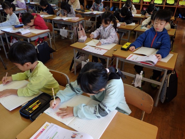 1年生の5時間目は国語の授業でした。漢字ドリルを使って漢数字の学習をしていました。ドリルの使い方についての説明を聞きながら「一」から順番に、音・訓読みや用法、画数を書き込んでから練習していきました。先生から「空いているスペースにその漢字を使ったことばが書いてあったら花丸だよ」と言われ、張り切る子どもたちでした。
