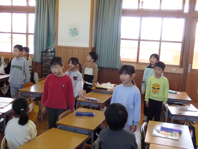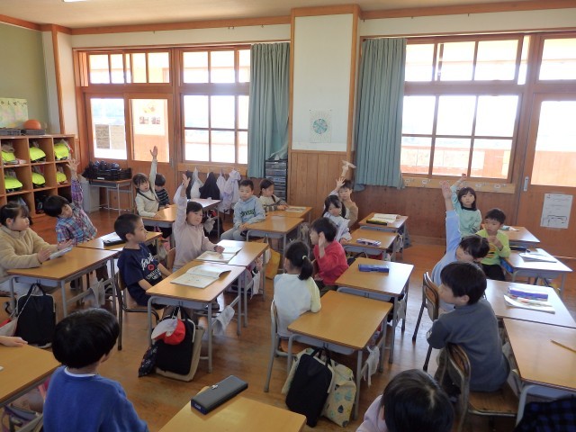 1年生の4時間目は学活の授業でした。学習発表会の劇の中で披露する歌の練習をしていました。2つに分かれて向かい合い、お互いの歌を聞き合いました。一方のチームが歌い終わったら、もう一方のチームが「よかったところ」を発表していきます。たくさん手が挙がっていますね。