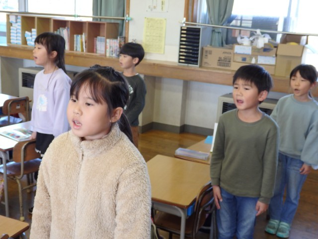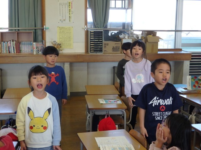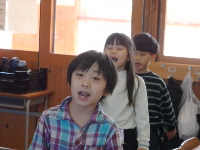 1年生の3時間目は生活の授業でした。学習発表会の練習をしていました。「おおきなかぶ」の劇をします。場面ごとのグループになってセリフと動きの連取をしていました。「うんとこしょ どっこいしょ」とかぶを引く場面では、みんなでつながって楽しそうに練習していました。もう自分のセリフを覚えて、見ないで言える子がたくさんいました。