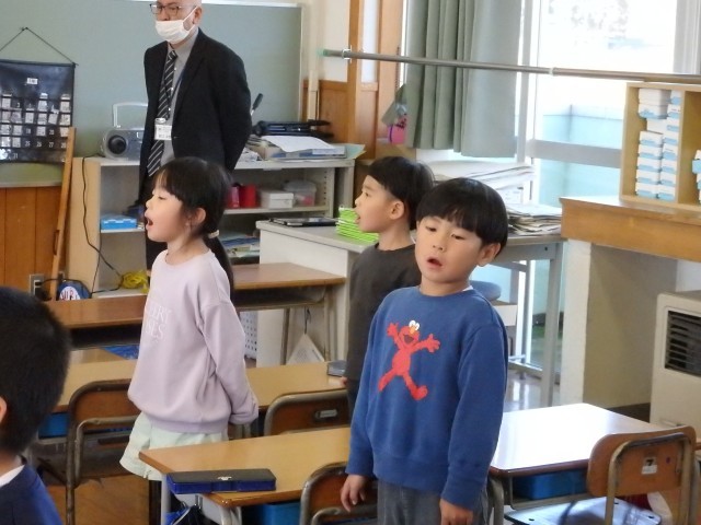 1年生の5時間目は国語の授業でした。「数え歌」の音読をしていました。「一つ ひるねのくじらが一とう、二つ ふかふかざぶとん 二枚・・・」といろいろなものの数え方の学習です。まずは、先生の後に続いてみんなで音読をしました。教科書を持って、背筋がピンと伸びて姿勢がいいですね。続いて1人1人が自分のスピードで音読をしました。起立して読み、読み終わったら座っていきます。みんなが読み終わるのを待つ間、静かに黙読をします。文字を指で追いながらていねいに読んでいる子がいました。