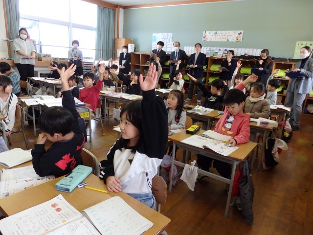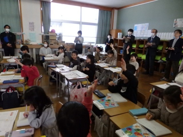 1年生の4時間目は学活の授業でした。学習発表会の劇の中で披露する歌の練習をしていました。2つに分かれて向かい合い、お互いの歌を聞き合いました。一方のチームが歌い終わったら、もう一方のチームが「よかったところ」を発表していきます。たくさん手が挙がっていますね。