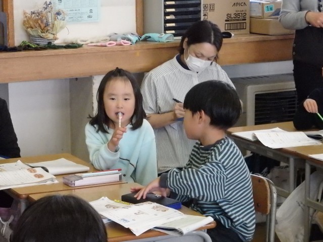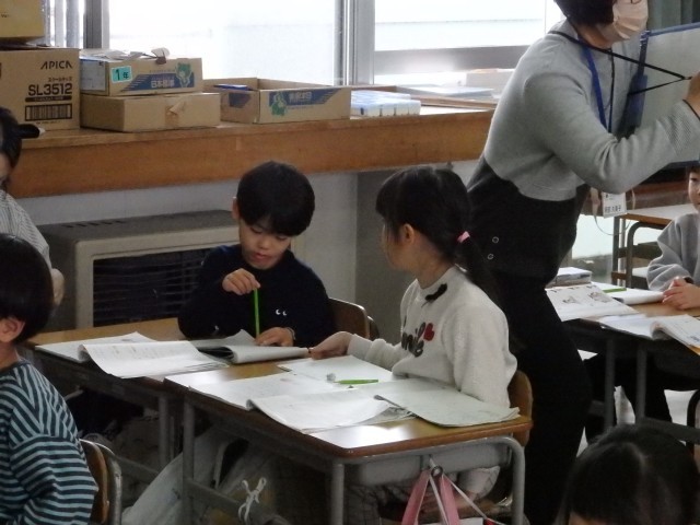 1年生の5時間目は算数の授業でした。「あわせていくつ」「ちがいはいくつ」「いくつといくつ」「何番目かな」など、今までに学習した内容の総まとめの問題に取り組んでいました。教科書4ページにわたる問題でしたが、教え合いながら頑張って取り組んでいました。