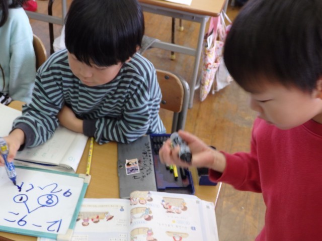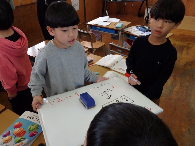 1年生の3時間目は算数の授業でした。市学習指導センターの指導主事や他校の先生、校内の先生たちとたくさんの人が参観しての授業です。「ケーキが12個ありました。そのうち9個食べました。残りは何個ですか」という問題に取り組みました。隣の人と話し合ったりしながら、問題文から分かることを発表していきました。「9個食べてなくなったから引き算」「残りはとあるから引き算」という意見が出たところで、12-9の計算の仕方を考えました。ホワイトボード、ブロックなどを使って、1人で考えたい人は1人で、友だちと考えたい人は協力して考えました。