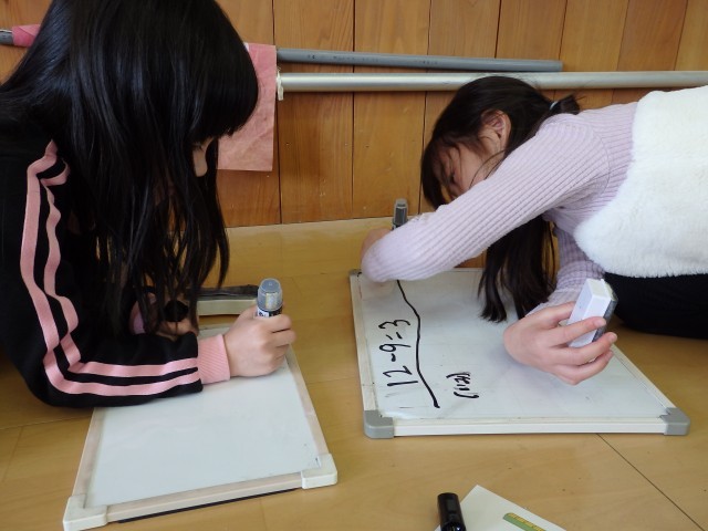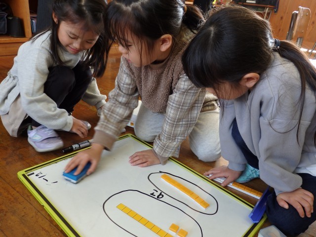 1年生の5時間目は算数の授業でした。「10ー6+3」の計算の仕方をどうやって説明したらよいか考えました。1人でじっくり考えたい子は1人で、友だちと教え合ったり話し合ったりして考えたい子はグループになり、ホワイトボードを使って考えました。式で考えたり、ブロックや図で考えたりしていました。自分の考えを他の人に説明できるようになれば、それだけ理解も深まりますね。