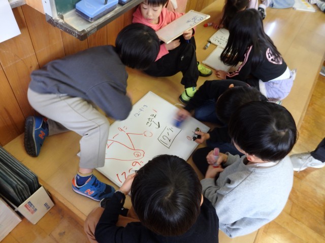 1年生の1時間目は算数の授業でした。「タマゴが3個入っているパックと9個入っているパックがあります。タマゴは合わせて何個ですか」という問題に取り組んでいました。子どもたちはすぐに足し算ということが分かり、3+9という式もできました。そして「3+9」をどうやって計算するかを考えました。「さくらんぼ算でやっていい?」と早く解きたくてウズウズしている子どもたち。1人で考えたい子は1人で、協力して考えたい子はグループになり、ホワイトボードに式や文を書きながらやり方を考えました。