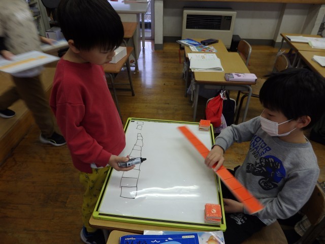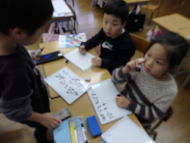 1年生の5時間目は算数の授業でした。「10ー6+3」の計算の仕方をどうやって説明したらよいか考えました。1人でじっくり考えたい子は1人で、友だちと教え合ったり話し合ったりして考えたい子はグループになり、ホワイトボードを使って考えました。式で考えたり、ブロックや図で考えたりしていました。自分の考えを他の人に説明できるようになれば、それだけ理解も深まりますね。